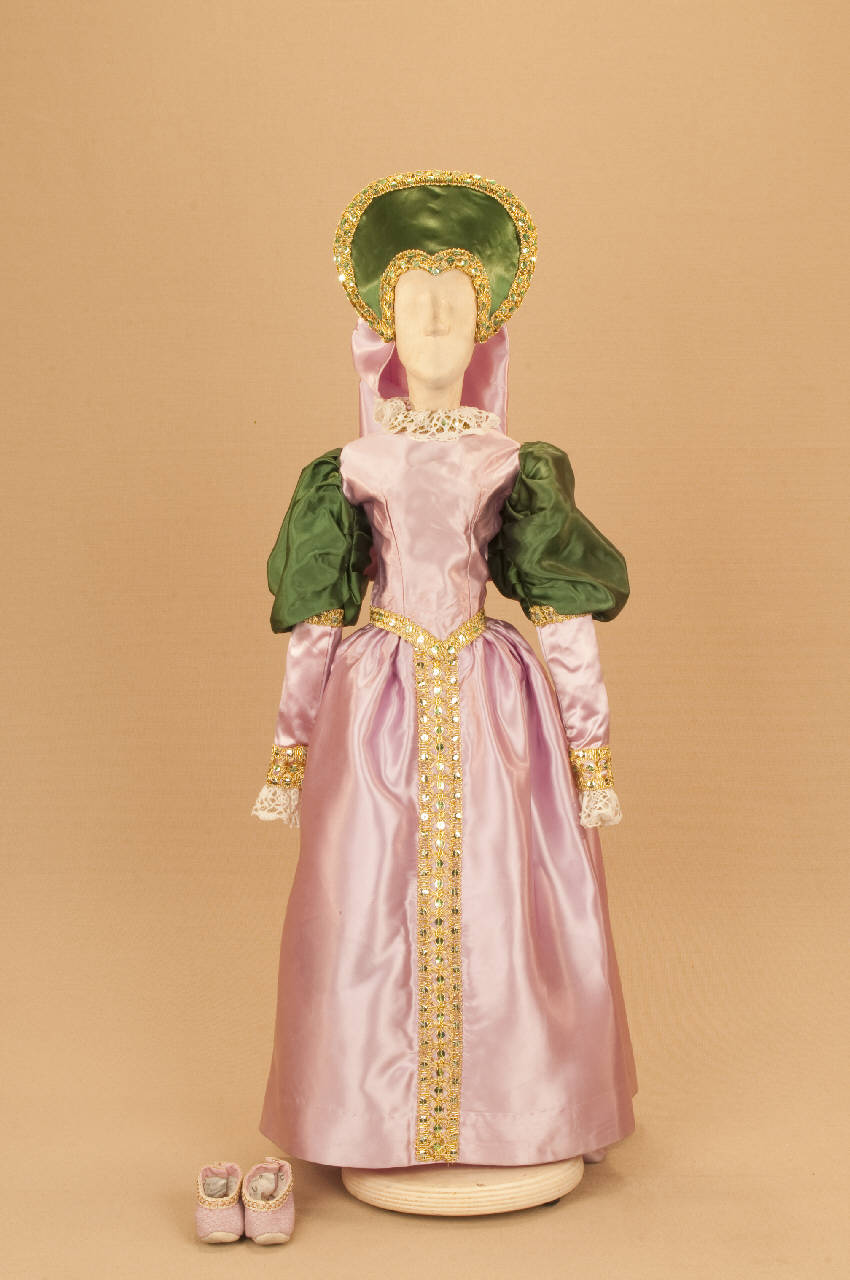 Costume da nobildonna di foggia cinquecentesca composto da gonna, corpino, scarpe e copricapo.