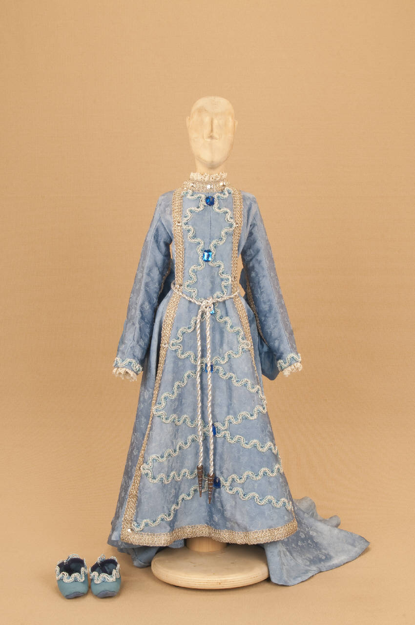 Costume da nobildonna di foggia quattrocentesca composto da veste e scarpe.