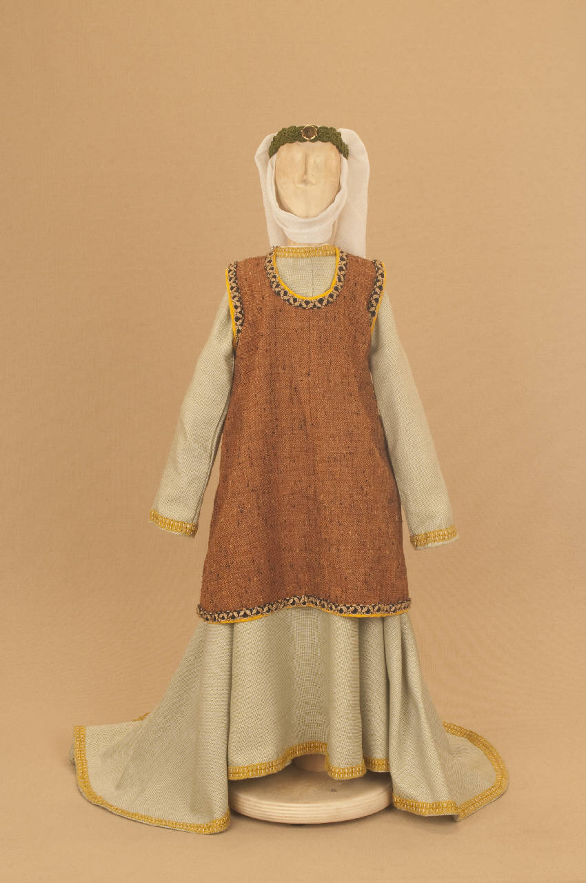 Costume da dama medievale composto da veste, sopravveste, soggolo, diadema e scarpe.