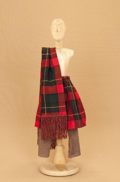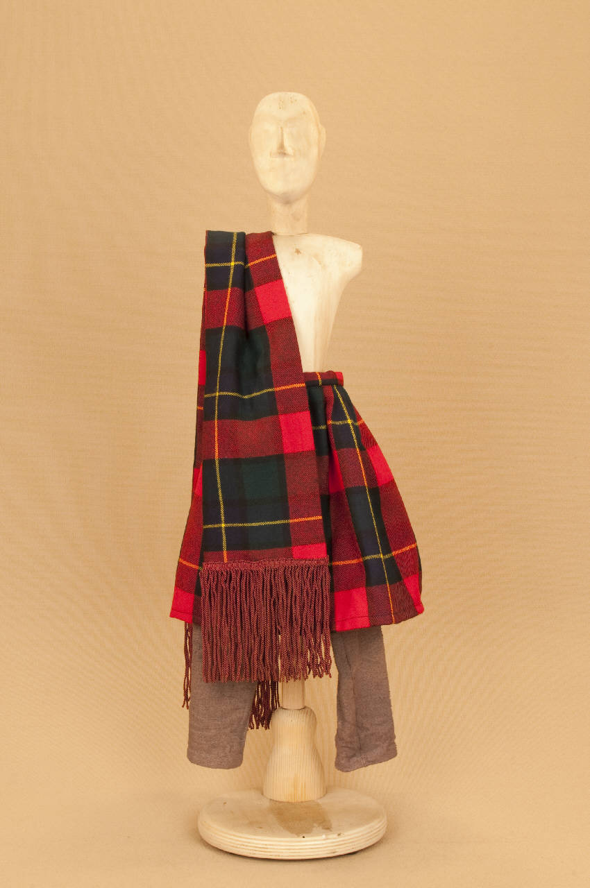 Costume da uomo scozzese composto da calzabraghe, kilt e sciarpa.