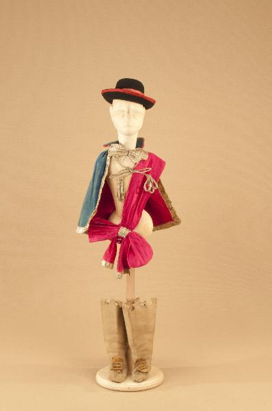 - NOTIZIE STORICO CRITICHE Il costume, che si completa con una gorgiera, è indossato da una marionetta con corpo e testa da gatto, in posizione eretta. "Il gatto con gli stivali" è una fiaba con struttura di operetta messa in scena nel 1911 da Carlo II Colla per la Compagnia Carlo Colla e Figli. Il manoscritto proviene dalla Compagnia Lupi che agiva al Teatro Gianduia di Torino: lo attesta una dicitura riportata sul retro della copertina. L¿edizione marionettistica della Compagnia Carlo Colla presenta nella forma della féerie (parti recitate alternate alle parti cantate e alle parti musicate) la celebre fiaba di Charles Perrault. La messa in scena risente del gusto dell'epoca verista dell'operetta e ricalca con notevole perizia i temi della nostra tradizione popolare. La musica del maestro Felice Camesasca sottolinea lo spettacolo in modo sovente ironico e sorprendente; le scene sono dello scenografo Achille Lualdi (1869-anni ¿50).\nIntervengono inoltre nello spettacolo, intuizioni culturali come il richiamo al mondo degli animali di La Fontane nel gioco teatrale del capovolgimento fra animale ed essere umano.\n"Il gatto con gli stivali" è una delle prime fiabe ad entrare nel repertorio della Compagnia Carlo Colla e Figli.\nNegli anni ¿20 alcuni costumi vengono sostituiti con abiti realizzati da Caramba. Nel 1946 viene realizzato dalla casa di produzione "Saturnia" un cortometraggio, per la regia di Mario Baffico (1907-1972). Nel 1973, in occasione delle riprese televisive prodotte dalla RAI per la trasmissione "Marionette e Burattini" con la regia di Eugenio Giacobino al Teatro Litta, Eugenio Monti Colla provvede al restauro di numerosi costumi. Nel 1987, per il riallestimento dello spettacolo al Teatro Litta, nell'ambito della collaborazione con il "CRT Artificio" (1986-1994), vengono realizzati nuovi costumi, nuove marionette e nuovi materiali di attrezzeria.