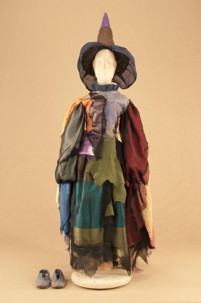 Costume fantastico femminile da strega composto da gonna, corpino, scarpe e cappello.