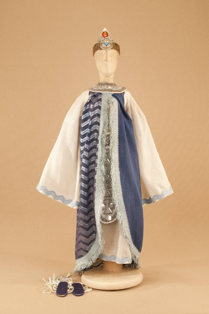 Costume da sacerdotessa di foggia egizia composto da veste, sopravveste, collo, cintura, sandali e diadema.