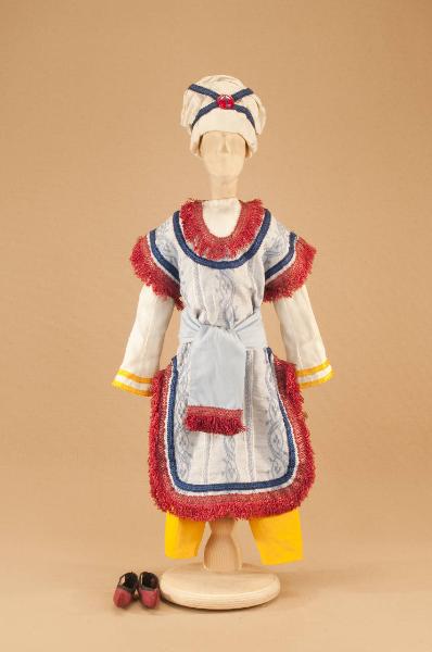 Costume folcloristico orientale composto da pantaloni, corpino, sopravveste, fusciacca, scarpe e turbante.