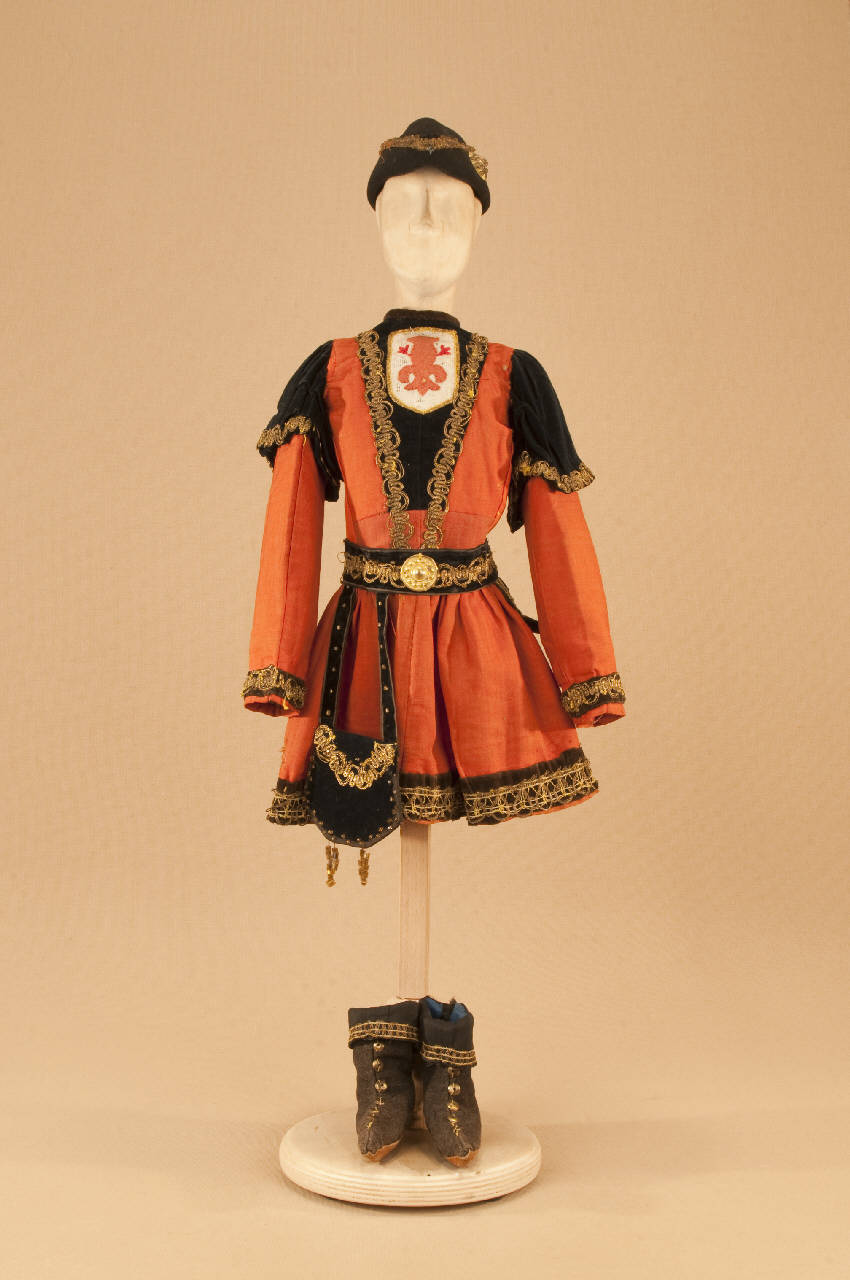 Costume militare di foggia quattrocentesca composto da veste, cintura (con borsetta), scarpe e cappello.