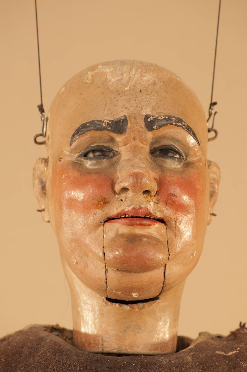 Testa in legno di tiglio con anello in ferro per bloccaggio al corpo. Occhi di vetro mobili. Bocca mobile. Tassello posteriore per intervenire sui meccanismi interni.