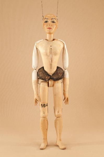 Testa di legno di tiglio fissata al corpo tramite ferro, occhi di vetro. Corpo normale in abete. Gambe unite al bacino tramite bordione in ferro, ginocchia ad incastro mobile. Mani mobili in tiglio con dita scolpite e separate.