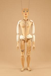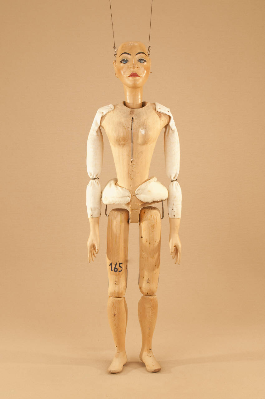 Testa di legno di tiglio fissata al corpo tramite ferro, occhi di vetro. Corpo normale in abete. Gambe unite al bacino tramite bordione in ferro, ginocchia ad incastro mobile. Mani in tiglio con dita scolpite e separate.