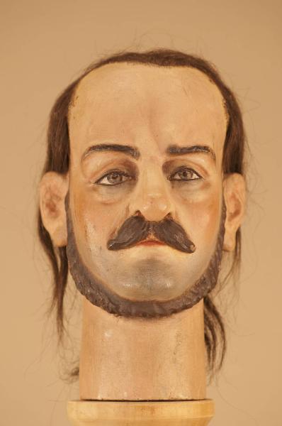Testa in legno del Costa Rica, capelli veri e foro nel collo. Baffi e barba sottogola scolpiti.