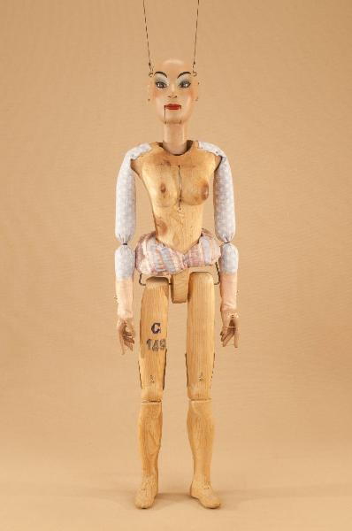 Testa di legno di tiglio fissata al corpo tramite ferro, occhi di vetro, bocca mobile. Corpo normale in abete. Gambe unite al bacino tramite bordione in ferro, ginocchia ad incastro mobile. Mani mobili in tiglio con dita scolpite e separate. Bilancino a croce metodo Holden.