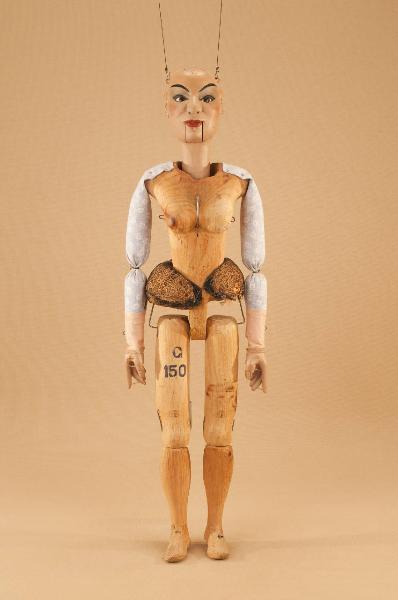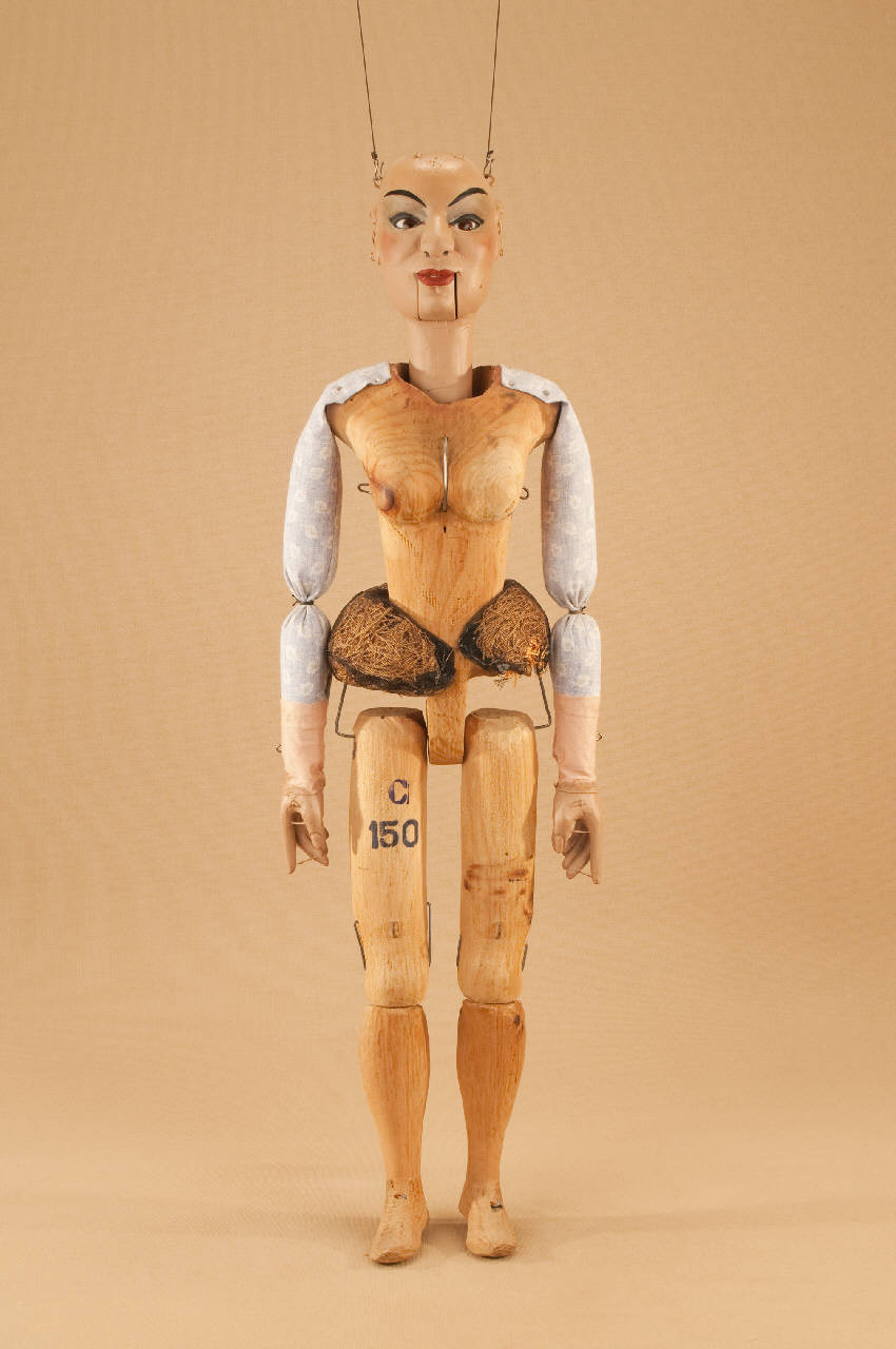 Testa di legno di tiglio fissata al corpo tramite ferro, occhi di vetro, bocca mobile. Corpo normale in abete. Gambe unite al bacino tramite bordione in ferro, ginocchia ad incastro mobile. Mani mobili in tiglio con dita scolpite e separate.