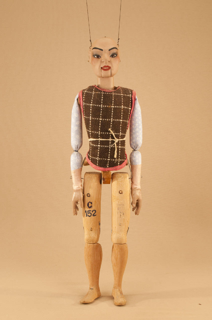 Testa di legno di tiglio fissata al corpo tramite ferro, occhi di vetro, bocca mobile. Corpo normale in abete. Gambe unite al bacino tramite bordione in ferro, ginocchia ad incastro mobile. Mani mobili in tiglio con dita scolpite e separate.