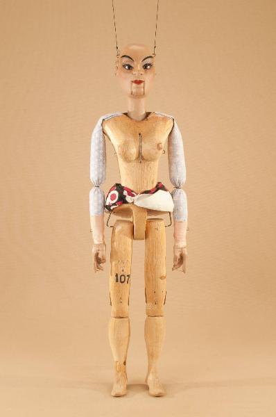 Testa di legno di tiglio fissata al corpo tramite ferro, occhi di vetro, bocca mobile. Corpo normale in abete. Gambe unite al bacino tramite bordione in ferro, ginocchia ad incastro mobile. Mani mobili in tiglio con dita scolpite e separate.