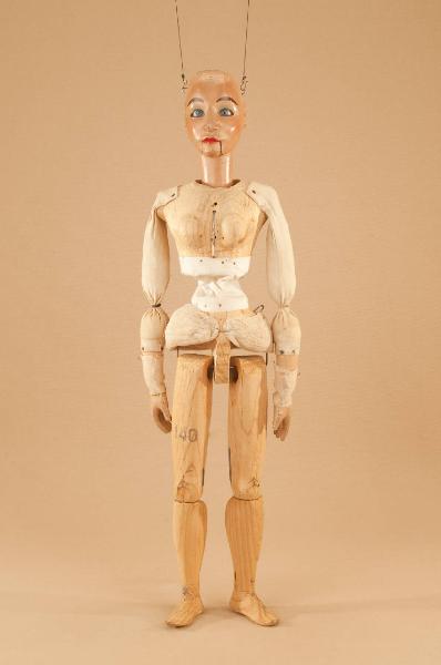 Testa di legno di tiglio fissata al corpo tramite ferro, occhi di vetro, bocca mobile. Corpo normale in abete snodato in vita con raccordo a doppio anello. Gambe unite al bacino tramite bordione in ferro, ginocchia ad incastro mobile. Mani mobili in tiglio con dita scolpite e separate. Bilancino a croce metodo Holden.