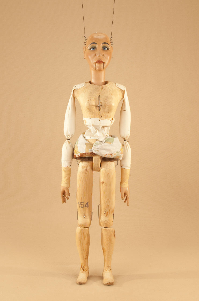 Testa di legno di tiglio fissata al corpo tramite ferro, occhi di vetro, bocca mobile. Corpo normale in abete snodato in vita con anelli e tela. Gambe unite al bacino tramite bordione in ferro, ginocchia ad incastro mobile. Mani mobili in tiglio con dita scolpite e separate. Bilancino a croce metodo Holden.