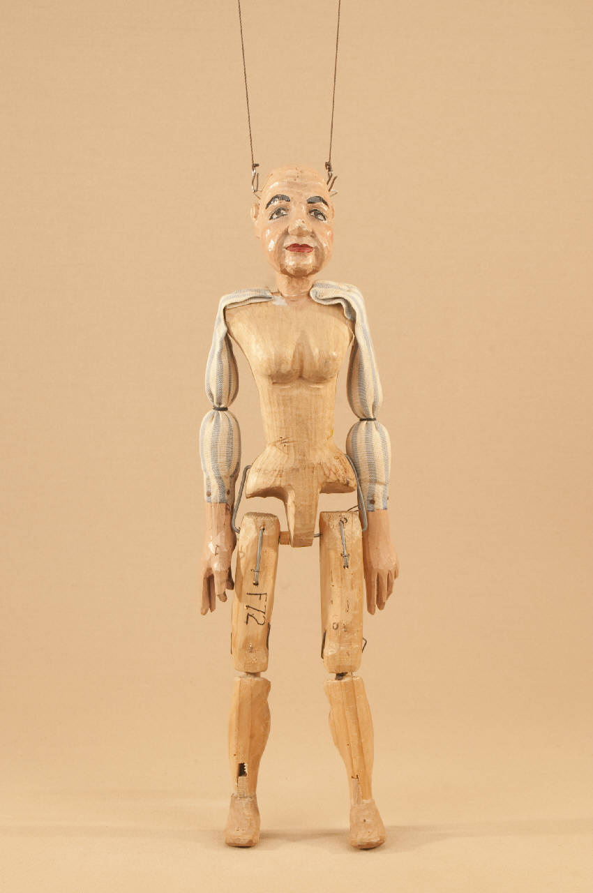 Testa di legno di tiglio. Corpo in tiglio. Gambe in abete unite al bacino tramite bordione in ferro, ginocchia ad incastro mobile. Mani in tiglio con dita scolpite e separate.
