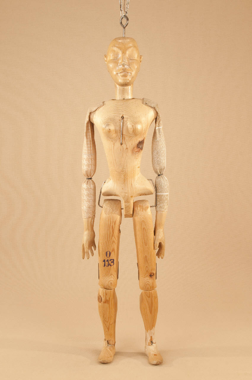 Testa di legno di tiglio fissata al corpo tramite ferro. Corpo normale in abete. Gambe unite al bacino tramite bordione in ferro, ginocchia ad incastro mobile. Mani in tiglio con dita scolpite e separate.