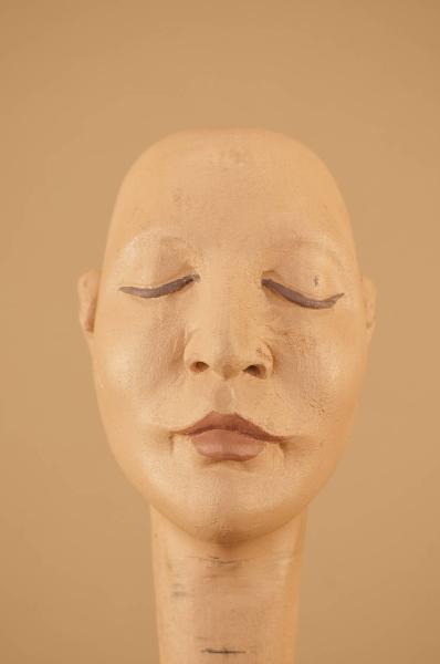 Testa in legno di tiglio senza occhi di vetro e con vite ad anello in acciaio alla base del collo.