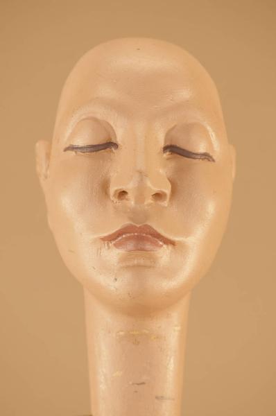 Testa in legno di tiglio senza occhi di vetro e con vite ad anello in acciaio alla base del collo.
