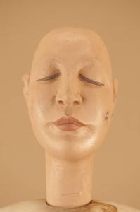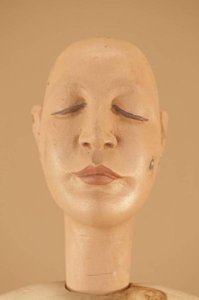 Testa in legno di tiglio senza occhi di vetro e con vite ad anello in acciaio alla base del collo.