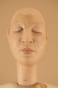Testa in legno di tiglio senza occhi di vetro e con vite ad anello in acciaio alla base del collo.