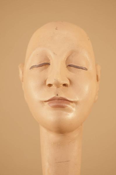 Testa in legno di tiglio senza occhi di vetro e con vite ad anello in acciaio alla base del collo.