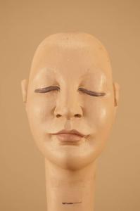 Testa in legno di tiglio senza occhi di vetro e con vite ad anello in acciaio alla base del collo.