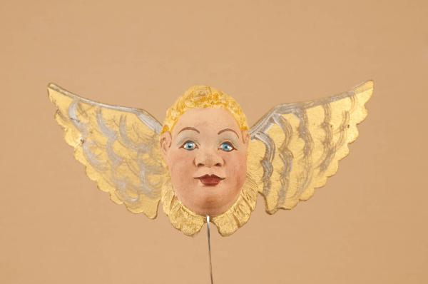 Testa in legno di tiglio. Ali in cartone unite con una molla piatta e inchiodate alla nuca.