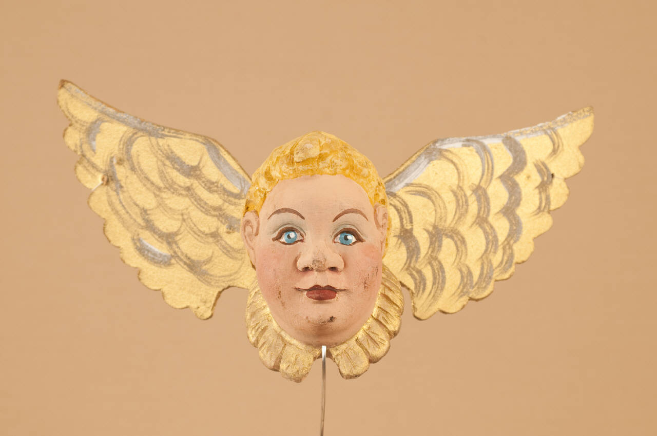 Testa in legno di tiglio. Ali in cartone unite con una molla piatta e inchiodate alla nuca.
