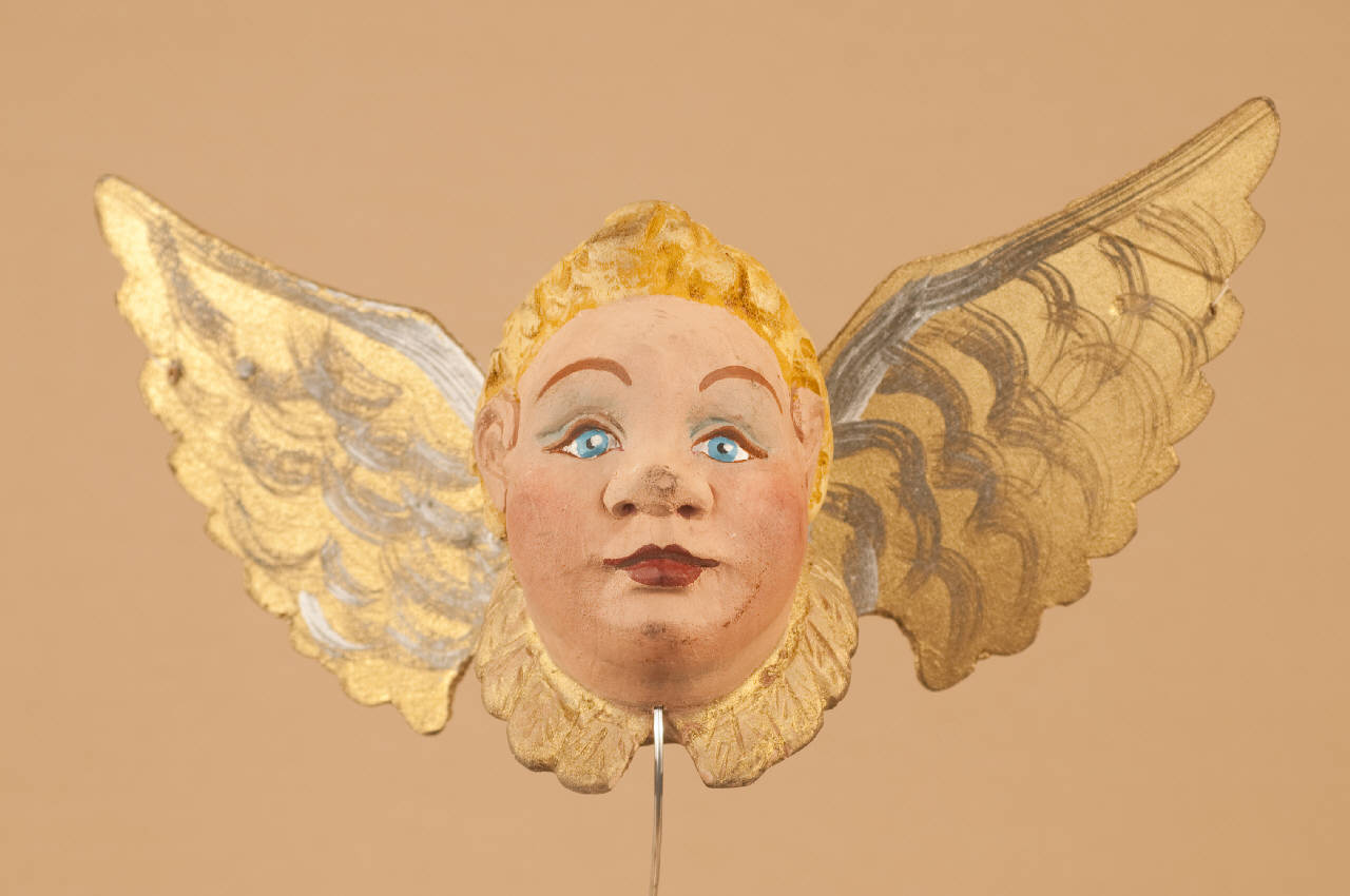 Testa in legno di tiglio. Ali in cartone unite con una molla piatta e inchiodate alla nuca.