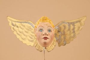 Testa in legno di tiglio. Ali in cartone unite con una molla piatta e inchiodate alla nuca.