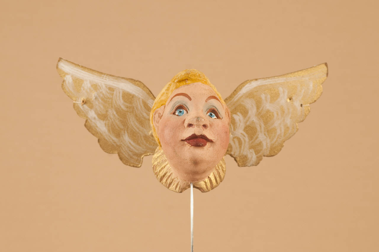 Testa in legno di tiglio. Ali in cartone unite con una molla piatta e inchiodate alla nuca.