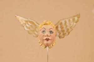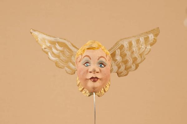 Testa in legno di tiglio. Ali in cartone unite con una molla piatta e inchiodate alla nuca.
