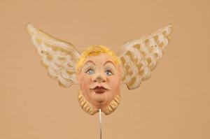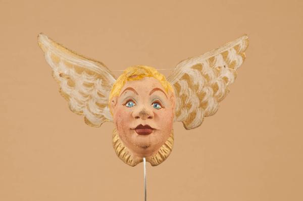 Testa in legno di tiglio. Ali in cartone unite con una molla piatta e inchiodate alla nuca.
