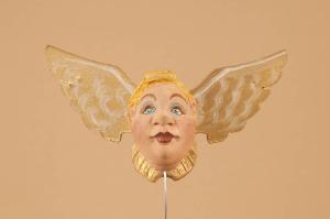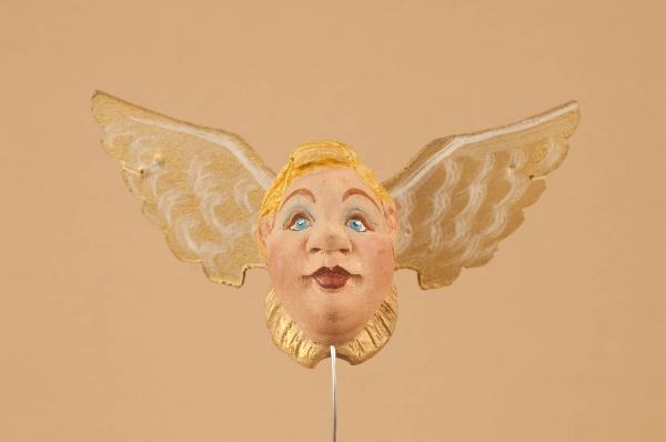 Testa in legno di tiglio. Ali in cartone unite con una molla piatta e inchiodate alla nuca.