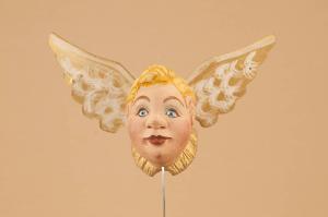 Testa in legno di tiglio. Ali in cartone unite con una molla piatta e inchiodate alla nuca.