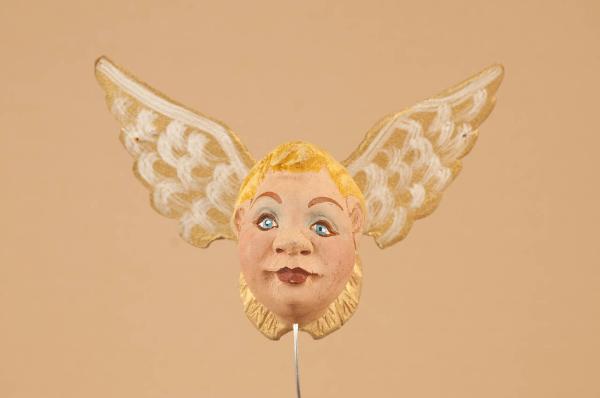 Testa in legno di tiglio. Ali in cartone unite con una molla piatta e inchiodate alla nuca.