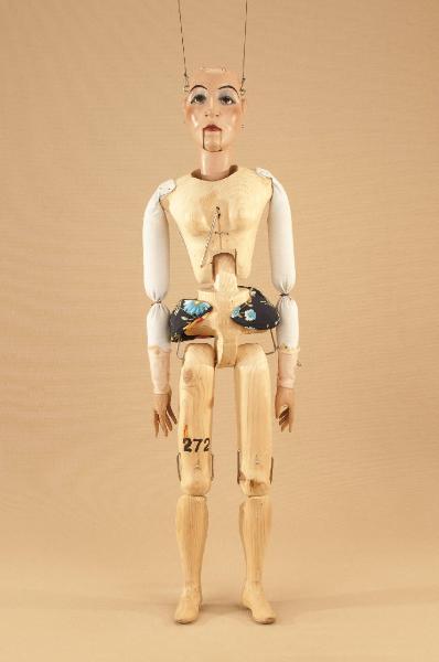 Testa di legno di tiglio fissata al corpo tramite ferro, occhi di vetro, bocca mobile. Corpo normale in abete snodato in vita ad incastro. Gambe unite al bacino tramite bordione in ferro, ginocchia ad incastro mobile. Mani mobili in tiglio con dita scolpite e separate. Bilancino a croce metodo Holden.
