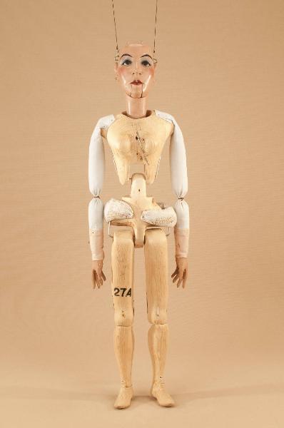 Testa di legno di tiglio fissata al corpo tramite ferro, occhi di vetro, bocca mobile. Corpo normale in abete snodato in vita ad incastro. Gambe unite al bacino tramite bordione in ferro, ginocchia ad incastro mobile. Mani mobili in tiglio con dita scolpite e separate. Bilancino a croce metodo Holden.