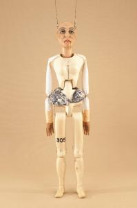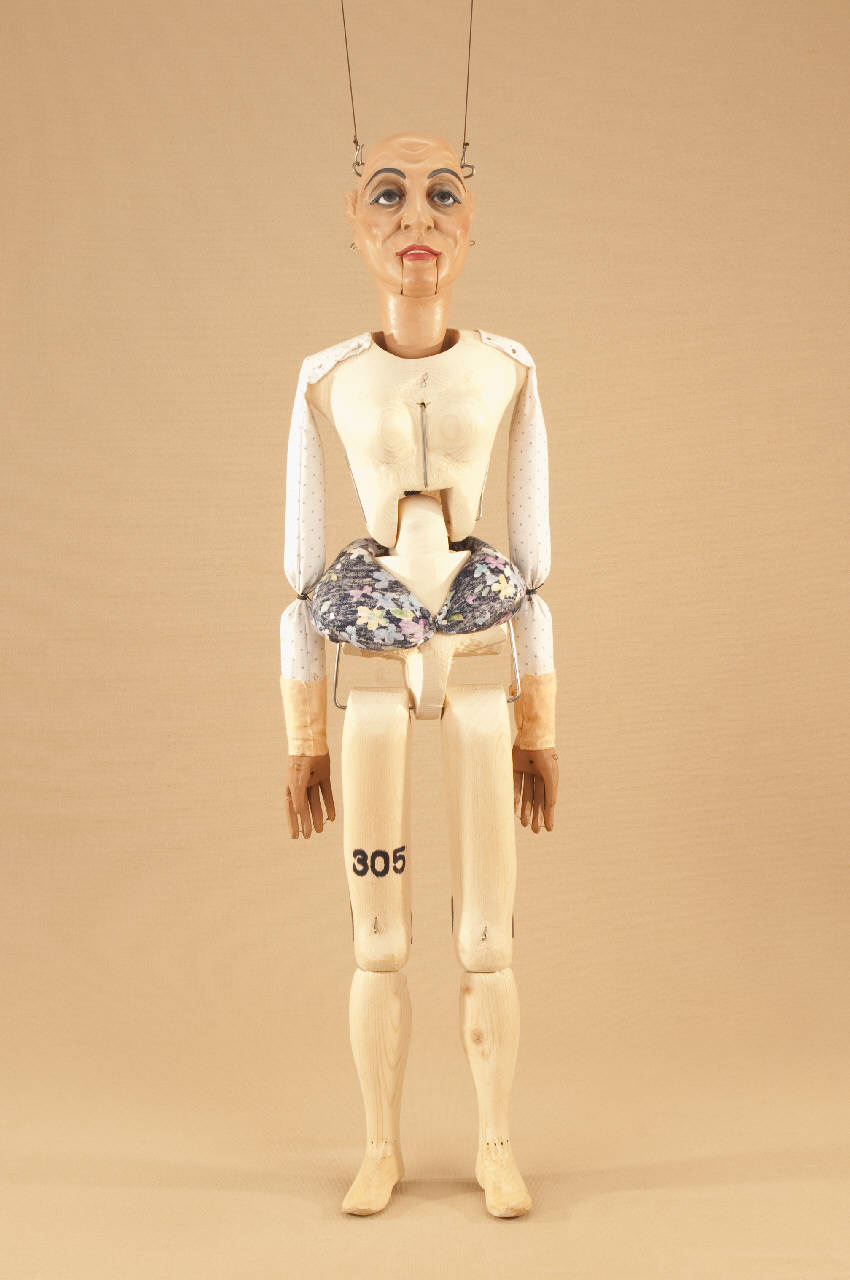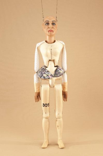 Testa di legno di tiglio fissata al corpo tramite ferro, occhi di vetro, bocca mobile. Corpo normale in abete snodato in vita ad incastro. Gambe unite al bacino tramite bordione in ferro, ginocchia ad incastro mobile. Mani mobili in tiglio con dita scolpite e separate. Bilancino a croce metodo Holden.