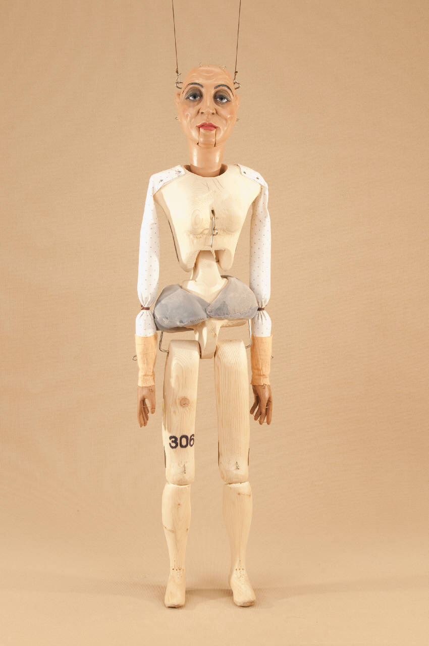 Testa di legno di tiglio fissata al corpo tramite ferro, occhi di vetro, bocca mobile. Corpo normale in abete snodato in vita ad incastro. Gambe unite al bacino tramite bordione in ferro, ginocchia ad incastro mobile. Mani mobili in tiglio con dita scolpite e separate. Bilancino a croce metodo Holden.