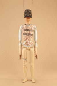 Testa in legno di tiglio fissata al corpo tramite ferro, occhi di vetro. Bocca mobile. Corpo in abete. Mani mobili con dita scolpite e separate. Piedi e braccia piombati. Bilancino a croce metodo Holden.