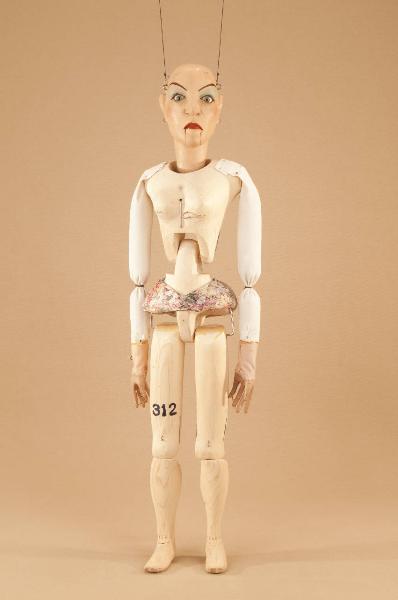 Testa di legno di tiglio fissata al corpo tramite ferro, occhi di vetro, bocca mobile. Corpo normale in abete snodato in vita ad incastro. Gambe unite al bacino tramite bordione in ferro, ginocchia ad incastro mobile. Mani mobili in tiglio con dita scolpite e separate. Bilancino a croce metodo Holden.