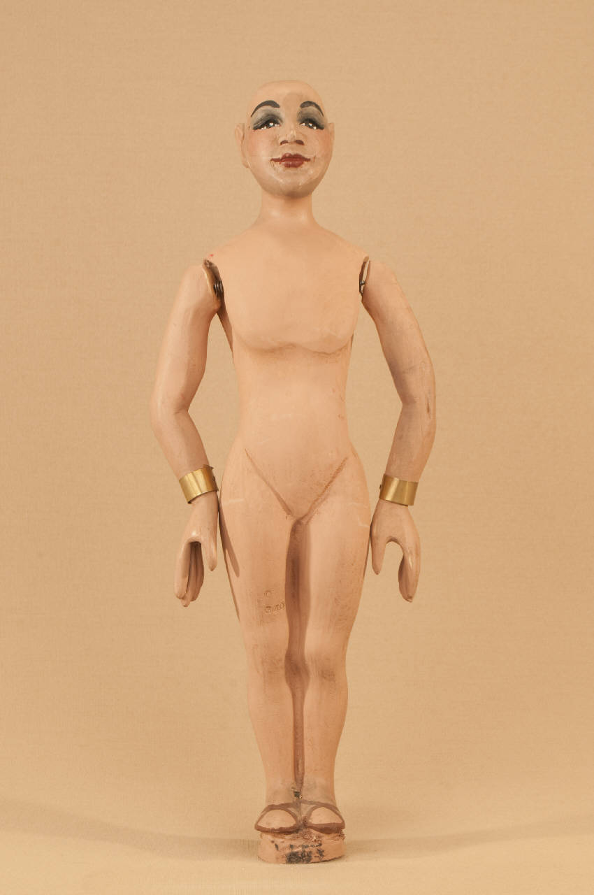Marionetta in legno di tiglio che ha mobili solo le braccia. Bracciali in ottone ai polsi.