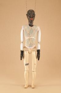 Testa in legno di tiglio fissata al corpo tramite ferro, occhi di vetro, bocca mobile. Corpo grande in abete snodato in vita ad incastro, gambe unite al bacino tramite bordione in ferro, ginocchia ad incastro, mani in tiglio mobili con dita scolpite e separate, piedi piombati, bilancino a croce metodo Holden.