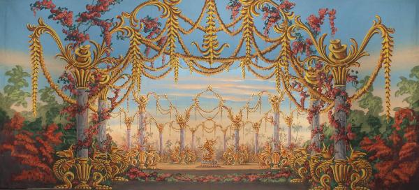 Scenografia composta da due principali e un fondale. Supporto in carta siling avana extra da 80 g. al mq. dipinta con colori ad acqua uniti da leganti vinilici e fortezzata lungo i bordi perimetrali e lungo le linee di piegatura con strisce di tela in cotone di varia grammatura.
