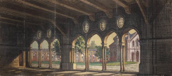 - NOTIZIE STORICO CRITICHE Scenografia realizzata per l'allestimento dello spettacolo. "Cristoforo Colombo" è stato scritto da Carlo II Colla nel 1898 a Biella, con scene di Leone Mens e musica del maestro Levis Ramella. Si tratta del terzo kolossal con duecento personaggi del repertorio della Compagnia Marionettistica Carlo Colla e Figli che segue "Excelsior" e "Il giro del mondo in ottanta giorni", a celebrare il progresso e l'uomo di età positivista. Lo sviluppo drammaturgico segue le tappe fondamentali dell'impresa del navigatore genovese utilizzando la formula del ballo si Scuola Scaligera ed alterna parti mimate parti danzate. Nel 1948 fu realizzata una versione cinematografica dello spettacolo. L'azione teatrale di Carlo II Colla segue l'impresa del navigatore genovese dal suo arrivo al Convento di S. Maria della Rabida, alla discussione del suo progetto di circumnavigazione con i dotti dell'Università di Salamanca sino alla richiesta di protezione fatta ai sovrani a Santa Fè durante l'assedio della città di Granada. L'intercessione della regina Isabella fa sì che la spedizione possa salpare dal porto di Palos. Lo spettacolo proseguiva con l'ammutinamento dei marinai, lo sbarco sull'isola di Guanahani sino al rientro in Spagna di Colombo per subire un processo. La concezione ottocentesca in cui era nato lo spettacolo prevedeva che al protagonista morente si offrisse la visione della gloria futura.\nNel 1992, da una coproduzione con il Teatro alla Scala, nacque un nuovo allestimento che univa a questa azione mimica, alcune parti cantate dell'opera di Franchetti.