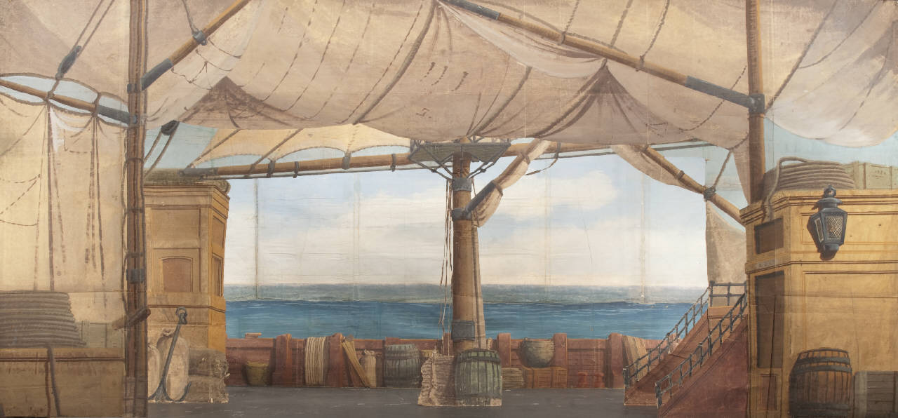 Scenografia composta da due principali e quattro rompimenti. Supporto in carta porosa 80 g. al mq. di colore écru e liscia da 80 g. al mq. di colore paglierino dipinta con colori ad acqua e fortezzata lungo i perimetri e le linee di piegatura con strisce in tela di cotone di diverse grammature. Allunghi più recenti in carta siling avana extra da 80 g. al mq.