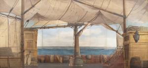 - NOTIZIE STORICO CRITICHE Scena realizzata per l'allestimento dello spettacolo "Cristoforo Colombo", scritto da Carlo II Colla nel 1898 a Biella. Le scene erano di Leone Mens e la musica del maestro Levis Ramella. Si tratta del terzo kolossal con duecento personaggi del repertorio della Compagnia Marionettistica Carlo Colla e Figli che segue "Excelsior" e "Il giro del mondo in ottanta giorni", a celebrare il progresso e l'uomo di età positivista. Lo sviluppo drammaturgico segue le tappe fondamentali dell'impresa del navigatore genovese utilizzando la formula del ballo si Scuola Scaligera ed alterna parti mimate parti danzate. Nel 1948 fu realizzata una versione cinematografica dello spettacolo. L'azione teatrale di Carlo II Colla segue l'impresa del navigatore genovese dal suo arrivo al Convento di S. Maria della Rabida, alla discussione del suo progetto di circumnavigazione con i dotti dell'Università di Salamanca sino alla richiesta di protezione fatta ai sovrani a Santa Fè durante l'assedio della città di Granada. L'intercessione della regina Isabella fa sì che la spedizione possa salpare dal porto di Palos. Lo spettacolo proseguiva con l'ammutinamento dei marinai, lo sbarco sull'isola di Guanahani sino al rientro in Spagna di Colombo per subire un processo. La concezione ottocentesca in cui era nato lo spettacolo prevedeva che al protagonista morente si offrisse la visione della gloria futura.\nNel 1992, da una coproduzione con il Teatro alla Scala, nacque un nuovo allestimento che univa a questa azione mimica, alcune parti cantate dell'opera di Franchetti.