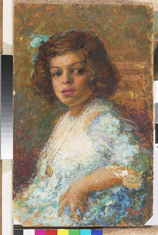 - NOTIZIE STORICO CRITICHE C'è uno strano magnetismo in questo visino pensoso e vagamente sorpreso. La sua apparente tranquillità è forse tradita dal moto tormentato e involontario della piccola mano, che riassume quella tipica irrequietezza infantile, alla quale il pittore ha rubato minuti preziosi. Pasinetti realizza questo studio su cartone con una probabile e rapida sottotraccia a matita, poi dipinta con serrati e minuti tocchi di colore che nel volto della bimba compongono piacevoli vibrazioni luminose. Forse non sapremo mai se e dove si conserva l'opera finita di questo cartone preparatorio. Siamo tuttavia certi che solo qui, nella libertà del bozzetto, il pittore può risolvere un fiocco azzurro tra i capelli con tre semplici colpi di spatola (Boifava, 2007, p. 74).